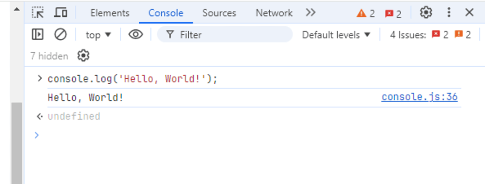 In the console, let's write a simple JavaScript code to display a message in the browser:
